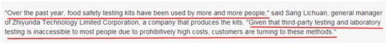 隨著中國食品安全事件的頻繁發生,越來越多的消費者通過購買食品安全快速檢測產品進行自我保護,這些產品可以檢測出食物中是否存在有害毒素、病原體和食品污染物。雖然專家們警告說這些快檢產品不能保證結果的絕對準確,但仍有很多消費者爭相購買。