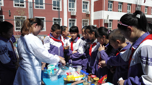 技術(shù)人員指導(dǎo)小學(xué)生現(xiàn)場(chǎng)動(dòng)手實(shí)驗(yàn)檢測(cè)地溝油