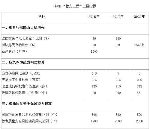 通過(guò)實(shí)施“糧安工程”,將全面深化細(xì)化和拓展《糧食行業(yè)“十二五”發(fā)展規(guī)劃綱要》目標(biāo),并使其更清晰完善。進(jìn)一步加強(qiáng)糧食倉(cāng)儲(chǔ)物流設(shè)施、糧油質(zhì)量安全檢驗(yàn)監(jiān)測(cè)能力建設(shè)和農(nóng)戶科學(xué)儲(chǔ)糧專項(xiàng),補(bǔ)充完善應(yīng)急供應(yīng)體系、強(qiáng)化糧情監(jiān)測(cè)和促進(jìn)節(jié)糧減損等相關(guān)目標(biāo),并將相關(guān)建設(shè)目標(biāo)延伸到“十三五”時(shí)期。