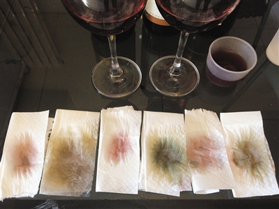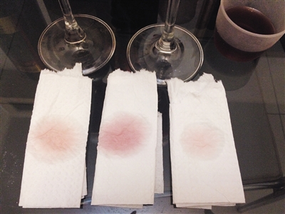 實驗分析:有傳言稱:“紅酒滴在餐巾紙上后,均勻擴散就是真酒。那是因為假紅酒色素顆粒大,會沉淀在巾紙中間,往外擴散的只是水跡?!?