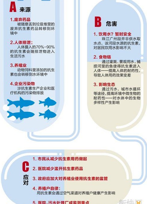 去年底,央視曝光珠江廣州河段的抗生素含量驚人,其中脫水紅霉素、磺胺嘧啶、磺胺二甲基嘧啶的含量分別為460納克/升、209納克/升和184納克/升。