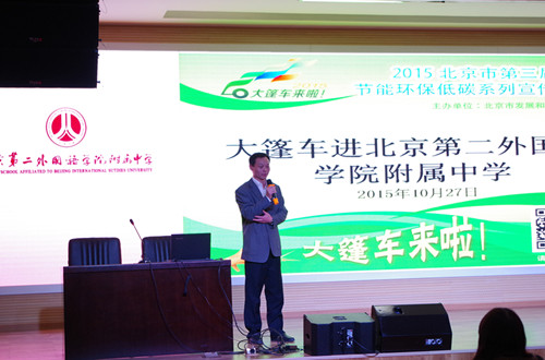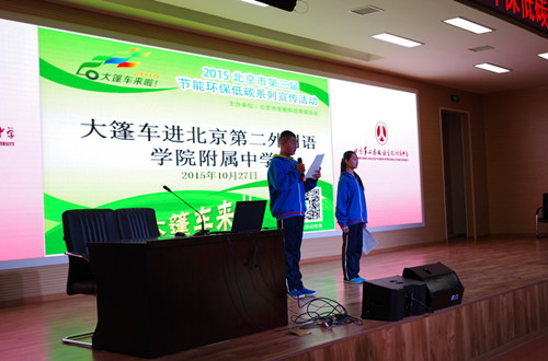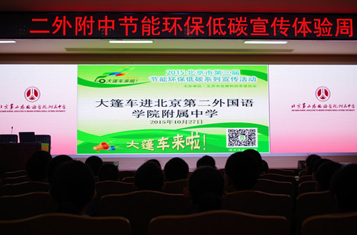 由北京市發(fā)展改革委員會主辦的2015北京市第三屆節(jié)能環(huán)保低碳系列宣傳活動“低碳大篷車”于2015年10月27日走進(jìn)北京第二外國語學(xué)院附屬中學(xué)。