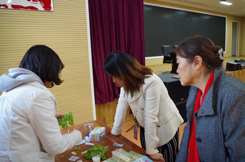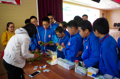 食品安全檢測消費(fèi)者體驗中心的老師帶領(lǐng)同學(xué)們親自動手體驗蔬菜中農(nóng)藥殘留檢測