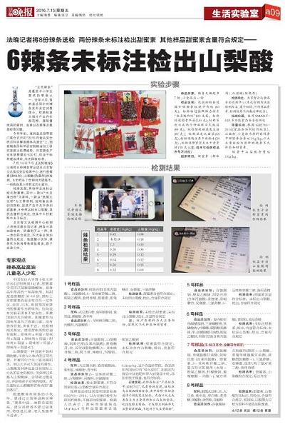 2016年7月14日12點,北京智云達科技股份有限公司再次與法制晚報聯合在食品安全檢測消費者體驗中心進行食品檢測實驗,并在樂嗨直播平臺進行現場直播,二戰告捷。如今食品安全問題往往是一波未平一波又起,維護食品安全迫在眉睫。本期主要內容是對不同種類辣條進行甜蜜素和山梨酸鉀含量檢測。