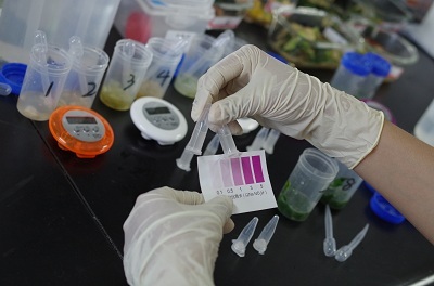 北京智云達技術工程師楊老師和趙老師將準備好的樣品分別進行標號,通過智云達自主研發生產的快速檢測產品:亞硝酸鹽速測管,對樣品進行快速檢測試驗。