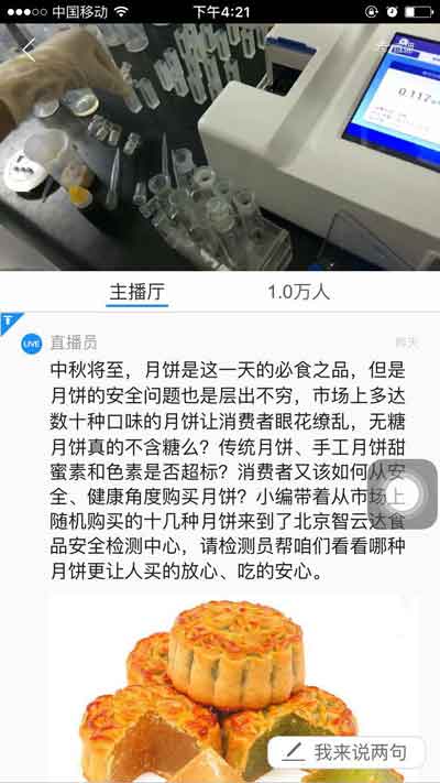 北京智云達本次與騰訊大燕網聯合直播,直播間為OMG!現在的月餅你還敢吃嗎?直播過程中在線人數突破一萬,并在持續增長中;直播過程中許多熱心網友進行提問,北京智云達技術人員都一一進行詳細解答。