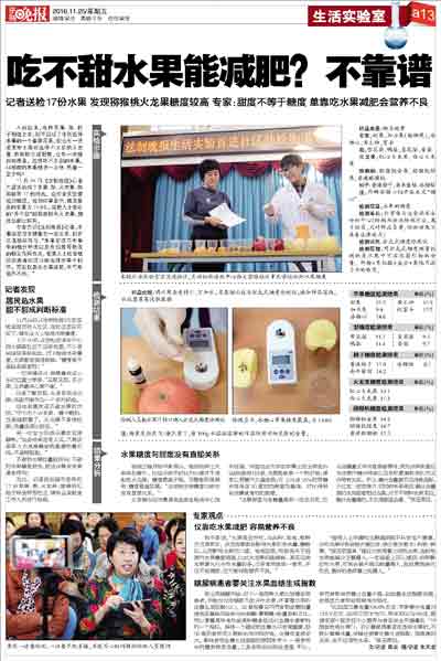 北京智云達(dá)提醒廣大消費(fèi)者:水果甜度與含糖量是有一定關(guān)系的,但與含糖量又并非直接畫等號(hào),因?yàn)樗鸲冗€與水果中糖分種類以及有機(jī)酸等物質(zhì)的相互作用有關(guān)系。所以糖分糖分高不見得就很甜。