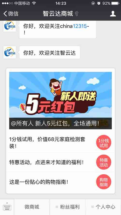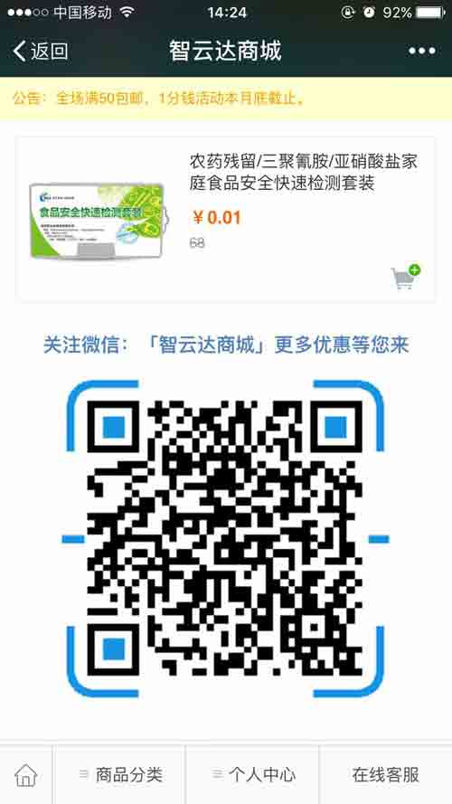 當(dāng)下微信人群活躍度高,微商城的開通為消費者在隨時隨地選購食品安全快速檢測產(chǎn)品開通一條更為優(yōu)惠、方便的購物通道。那么如何在智云達商城購買產(chǎn)品?