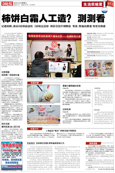 2016年12月08日9:00,北京智云達(dá)科技股份有限公司(以下簡(jiǎn)稱“北京智云達(dá)”)與法制晚報(bào)攜手制作走進(jìn)勁松街道八棵松社區(qū)活動(dòng),為消費(fèi)者免費(fèi)檢測(cè)柿餅中是否含有葡萄糖和果糖、柿霜中是否含有淀粉。