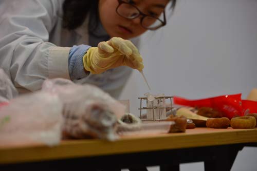 北京智云達(dá)技術(shù)工程師楊老師和王老師首先將柿餅表面的白霜沖洗到水中,再通過(guò)使用北京智云達(dá)自主研發(fā)生產(chǎn)的快速檢測(cè)產(chǎn)品:果糖和葡萄糖快速檢測(cè)試劑,對(duì)樣品溶液的果糖和葡萄糖含量進(jìn)行檢測(cè),而淀粉含量通過(guò)碘溶液進(jìn)行測(cè)定。