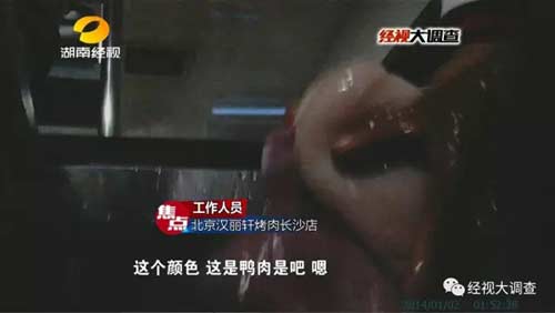 北京漢麗軒烤肉店遍布全國,可是在長沙這家店我們憤怒的看到,店里的所謂牛肉都是用鴨肉偽造,甚至還摻入變質的鴨肉,而且造假用的鴨肉都是統一配送過來的。若不是記者長時間辛苦的臥底調查,誰能知道其中真相!消費者會永遠被蒙蔽,欺詐伎倆會永遠繼續,漢麗軒會繼續“騙過全世界”。誠信不僅是經商的根本,更是做人的根本,對于這種弄虛作假的所謂全國連鎖,消費者不歡迎!我們期待執法部門重拳出擊,而不是為之遮丑掩蓋。