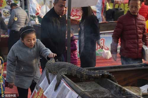 2017年1月31日,山東濱州,一燒烤攤主在春節(jié)廟會(huì)上銷售現(xiàn)烤現(xiàn)賣的鱷魚(yú)肉。廟會(huì)上,各類烤肉串、羊肉串已經(jīng)不鮮見(jiàn),但烤鱷魚(yú)肉不少趕廟會(huì)的人還是第一次見(jiàn),許多市民爭(zhēng)相嘗鮮。為了吸引顧客,攤主擺了張著大嘴的整條鱷魚(yú)當(dāng)招牌。