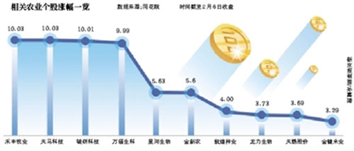 受此影響,2月6日,相關(guān)農(nóng)業(yè)股、期貨等均出現(xiàn)大漲,其中,農(nóng)產(chǎn)品加工、農(nóng)機(jī)等農(nóng)業(yè)股迎來新年首個紅包,漲幅居前,多只股票漲停。