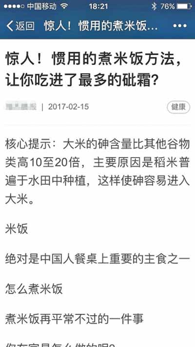 連日來,一則消息在很多人的微信朋友圈里瘋傳,大意是中國人日常慣用的煮米飯的方法,會讓人吃進去更多的砷,砷攝入過量,會增加患皮膚癌、膀胱癌、肺癌及心臟疾病的風險。