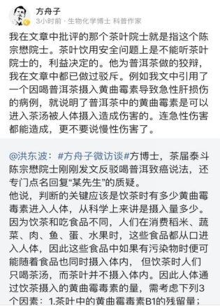 中國茶葉學會名譽理事長陳宗懋就方舟子的批評,撰寫長文反駁方舟子“普洱茶致癌論”,稱普洱茶并不是黃曲霉菌的適生基質,我國對普洱茶中黃曲霉素的含量抽查檢測中,檢出率很低且濃度不高。對此,方舟子9月13日回答網友提問時回應稱,“我文中引用了一個因喝普洱茶攝入黃曲霉素導致急性肝損傷的病例,就說明了普洱茶中的黃曲霉素是可以進入茶湯被人體攝入造成傷害的。連急性傷害都能造成,更不要說慢性傷害了。”