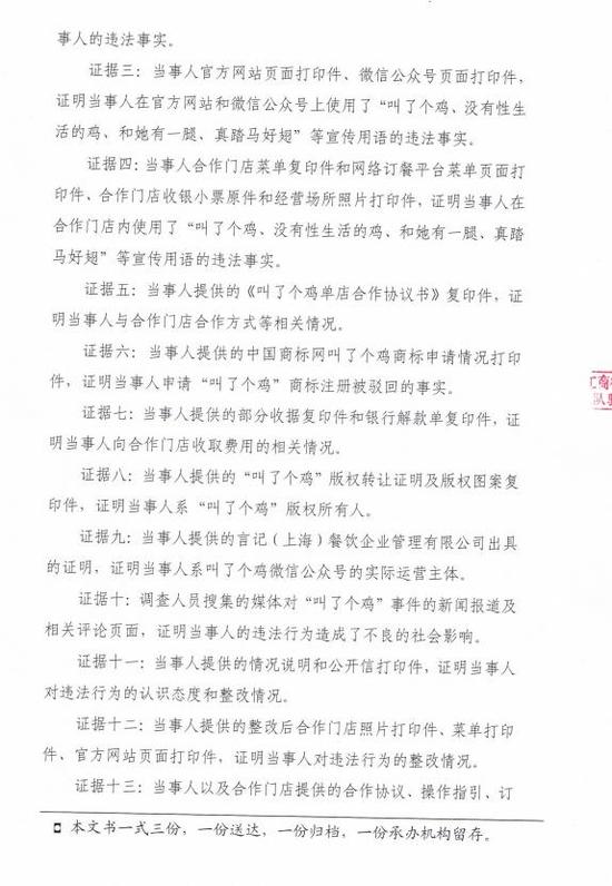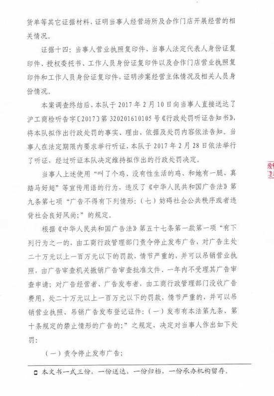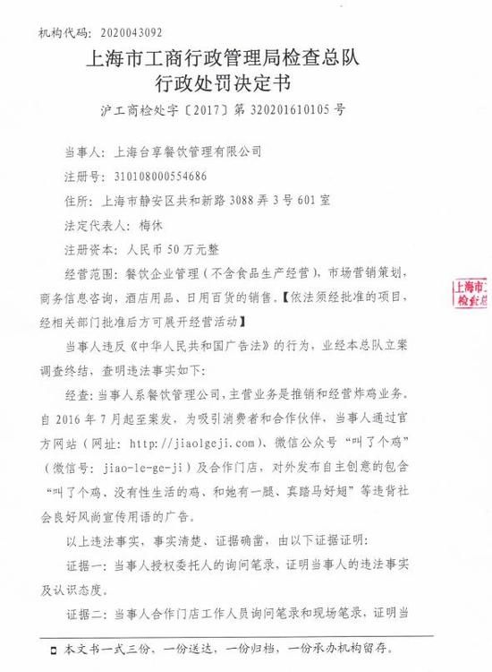 上海市工商行政管理局檢查總隊行政處罰書顯示,當(dāng)事人系餐飲管理公司,主營業(yè)務(wù)是推銷和經(jīng)營炸雞業(yè)務(wù),自2016年7月起至案發(fā),為吸引消費者和合作伙伴,當(dāng)事人通過官方網(wǎng)站、微信公眾號“叫了個雞”及合作門店,對發(fā)布自主創(chuàng)意的包含“叫了個雞,沒有性生活的雞、和她有一腿、真踏馬好翅”等違背社會良好風(fēng)尚用于的廣告。