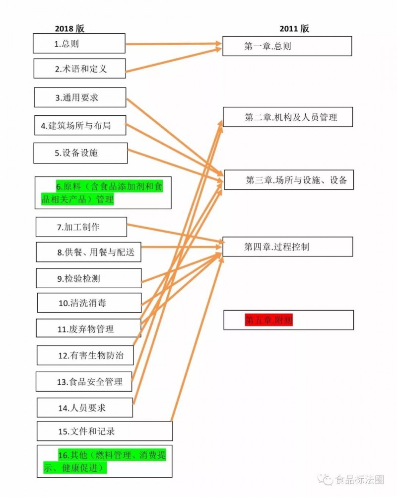 2018版《餐飲服務食品安全操作規(guī)范》分成了16個部分,分別是:1.總則、2.術語和定義、3.通用要求、4.建筑場所與布局、5.設備設施、6.原料(含食品添加劑和食品相關產品)管理、7.加工制作、8.供餐、用餐與配送、9.檢驗檢測、10.清洗消毒、11.廢棄物管理、12.有害生物防治、13.食品安全管理、14.人員要求、15.文件和記錄、16.其他(燃料管理、消費提示、健康促進)。
