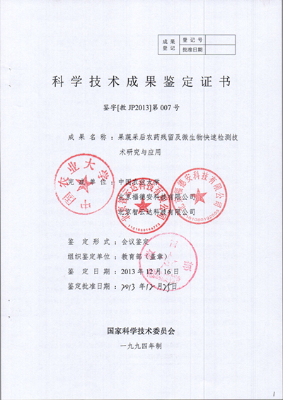 最終,智云達參與完成的“果蔬采后農(nóng)藥殘留及微生物快速檢測技術研究與應用”、 “精煉食用油摻偽快速檢測技術研究與應用項目”順利通過教育部科技成果鑒定,教育部已于12月25日向完成單位及各位完成者頒發(fā)了科學技術成果鑒定證書,這是對智云達研發(fā)能力的極大認可,智云達將加倍努力研發(fā)更多、更好的產(chǎn)品以保障我國食品安全,使智云達真正成為行業(yè)研發(fā)的領導者和行業(yè)第一品牌。