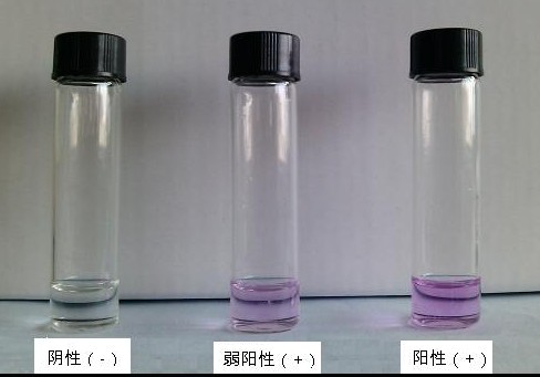 2min 內(nèi)觀察顏色變化,若溶液出現(xiàn)粉紅至紫紅色,則判為陽性(+);無色判為陰性(-)。