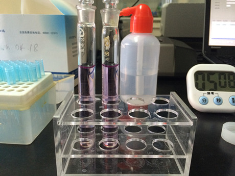 4、加入F溶液0.5mL,迅速蓋塞顛倒兩次,迅速加入E溶液1mL,蓋塞混勻,靜置7min。