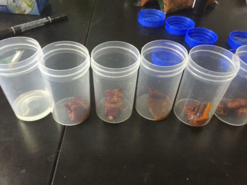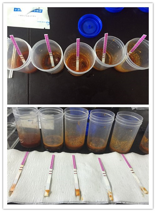 我們隨機(jī)取一點(diǎn)火鍋底料,放入干凈的容器中,加入5ml蒸餾水進(jìn)行溶解,發(fā)現(xiàn)有幾種由于含油量較高,凝結(jié)成塊,無(wú)法很快溶解,因此我們對(duì)其稍微加熱,使得完全溶解。完全溶解后即得到我們的火鍋樣品。