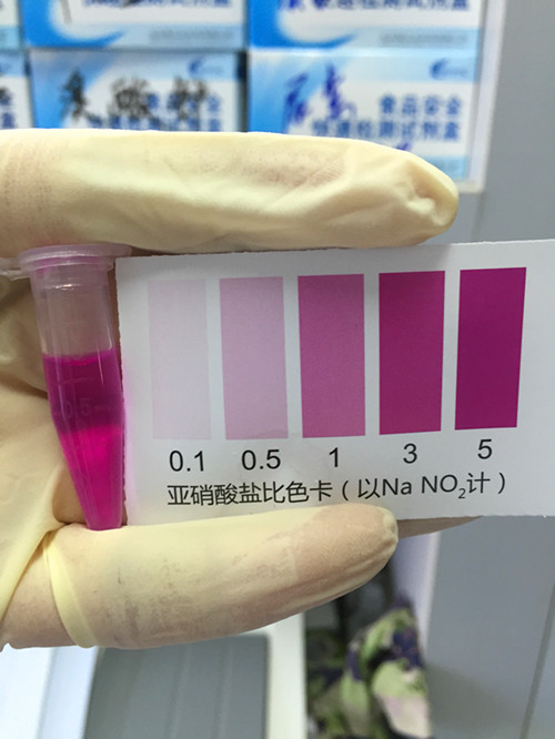 通過顏色比對,我們可以清楚看到顏色由無色變?yōu)樽仙瑓⒄諏Ρ瓤ǎ芍藰颖局械膩喯跛猁}含量為30~50mg/kg,屬于陽性樣本。