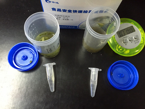 吸取 1mL 樣品液于 1.5mL 離心管中,滴加 3 滴銅試劑 A,滴加 3 滴銅試劑 B,滴加 6 滴銅試劑 C,蓋塞混勻,靜置 10min,觀察溶液顏色變化。溶液變藍色或者綠色,說明含有硫酸銅;溶液不變色說明樣品未噴灑硫酸銅。