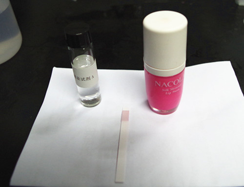 由于唇彩有顏色,因此加入稍許活性炭于檢測(cè)液中,攪拌均勻,過(guò)濾,靜置。取上清液進(jìn)行檢測(cè)。