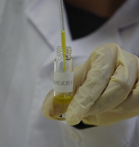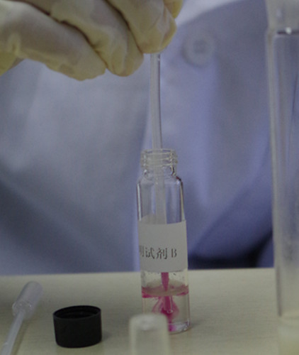 另取一支0.5 mL吸管,吸取試劑C至吸管細部前端約1/4處(約0.125 mL),插入至試劑B瓶的下層溶液中并緩慢排空,觀察B瓶下層溶液中是否產生渾濁絮狀物或沉淀物。