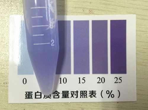 取4 mL顯色液加入比色管中,蓋上蓋,用力將奶粉全部搖溶,顯色3分鐘,在3~5分鐘內(nèi)將比色管襯在白紙上與標(biāo)準(zhǔn)比色卡進(jìn)行對(duì)比,找出與乳粉蛋白質(zhì)標(biāo)準(zhǔn)比色卡上相近的色階,即為每100g乳粉樣品中蛋白質(zhì)的含量。