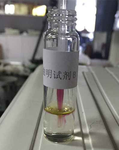 另取一支0.5 mL吸管,吸取試劑C至吸管細部前端約1/4處(約0.125 mL),插入至試劑B瓶的下層溶液中并緩慢排空,觀察B瓶下層溶液中是否產(chǎn)生渾濁絮狀物或沉淀物。